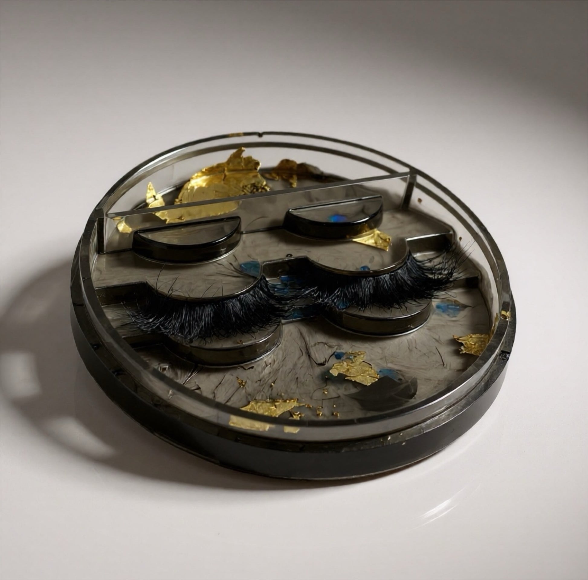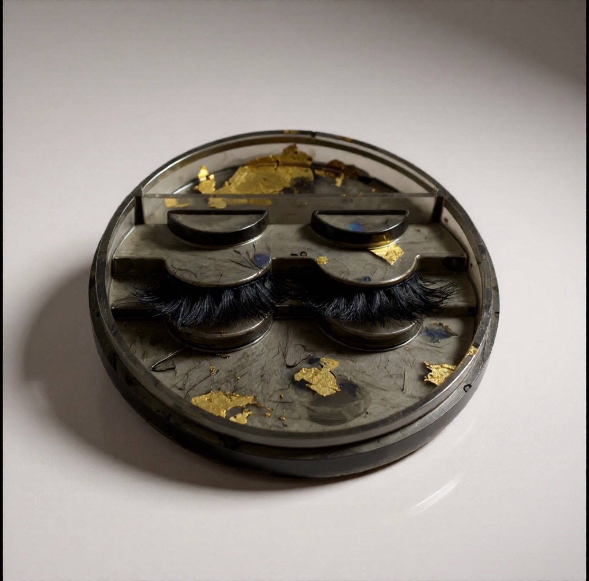 Our lashes are packed with a beautiful handmade resin lash container, spooly, and a stainless steel lash applicator tool.